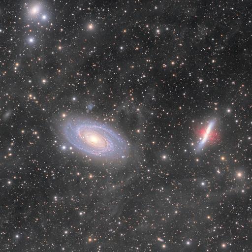 | Keywords: messier 81 messier81 messier 82 messier82 integrated flux nebula integratedfluxnebula galaxy Messier 81 - 82 and Integrated Flux Nebula Credits: Leonardo Ciuffolotti, Andrea Pistocchini, Giuseppe Nicosia, Alessandro Falesiedi, Tim Stone, Giuseppe Donatiello . J2000 09h 55m 33.2s +69° 3′ 55″ Messier 81 (NGC 3031 or Bode's Galaxy) is a spiral galaxy at 12 million light-years in Ursa Major and it is the largest galaxy in the M81 Group, a group of 34 galaxies . M81 was discovered by Johann Elert Bode in 1774. RA: 09h 55m 52.2s Dec: +69° 40′ 47″ Messier 82 (NGC 3034) is a starburst galaxy at 12 million light-years. Messier 81 - 82 and Integrated Flux Nebula Credits: Leonardo Ciuffolotti, Andrea Pistocchini, Giuseppe Nicosia, Alessandro Falesiedi, Tim Stone, Giuseppe Donatiello . J2000 09h 55m 33.2s +69° 3′ 55″ Messier 81 (NGC 3031 or Bode's Galaxy) is a spiral galaxy at 12 million light-years in Ursa Major and it is the largest galaxy in the M81 Group, a group of 34 galaxies . M81 was discovered by Johann Elert Bode in 1774. RA: 09h 55m 52.2s Dec: +69° 40′ 47″ Messier 82 (NGC 3034) is a starburst galaxy at 12 million light-years. |