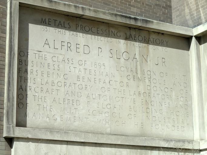 Keywords: Metals Processing Laboratory, MIT - DSC00266.JPG Plaque honoring Alfred P Sloan Jr at the Metals Processing Laboratory MIT Cambridge Massachusetts USA own 2011-03-26 Daderot Public domain Plaques in MIT Alfred Pritchard Sloan Jr Cc-zero