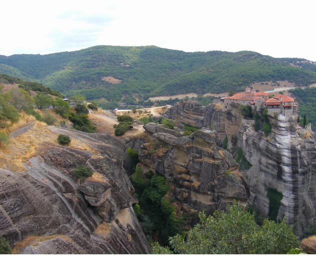 Keywords: meterora greece sky clouds mountains valley ravine gorge rocks rocky forest trees woods buildings cliff nature outside scenic country countryside summer spring