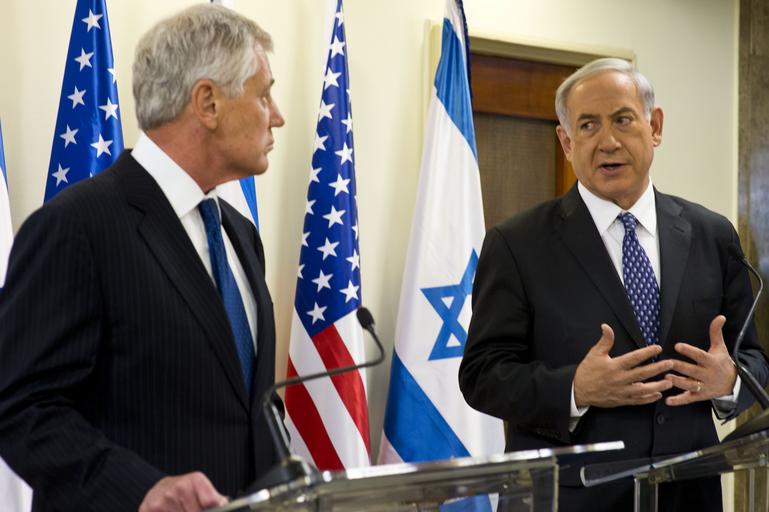 Keywords: Metting before a wreath laying ceremony 140516-D-BW835-125.jpg en U S Secretary of Defense Chuck Hagel left makes a joint press statement with Israeli Prime Minister Benjamin Netanyahu in Jerusalem May 16 2014 Hagel met with Netanyahu to discuss issues of mutual importance before laying wreaths at the graves of Theodore Herzl and Prime Minister Yitzhak Rabin to commemorate Israeli Independence Day Unit Defense Imagery Management Operations Center DVIDS Tags U S flag; OSD; DIMOC; Chuck Hagel; DVIDS Bulk Import 2014-05-16 DoD photo by Erin A Kirk-Cuomo/Released https //www dvidshub net/image/1353499/metting-before-wreath-laying-ceremony 140516-D-BW835-125 2014-05-20 21 55 JERUSALEM IL PD-USGov Chuck Hagel Images from DoD uploaded by Fæ |