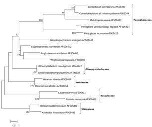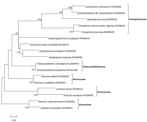Keywords: Metulodontia-Maximum-Likelihood.svg Figure Molecular Phylogenetic analysis of Metulodontia by the Maximum Likelihood method<br/> The evolutionary history was inferred by using the Maximum Likelihood method based on the Kimura 2-parameter model 1 The tree with the highest log likelihood -5311 8139 is shown The percentage of trees in which the associated taxa clustered together is shown next to the branches Initial tree s for the heuristic search were obtained by applying the Neighbor-Joining method to a matrix of pairwise distances estimated using the Maximum Composite Likelihood MCL approach A discrete Gamma distribution was used to model evolutionary rate differences among sites 5 categories +G parameter 0 4787 The rate variation model allowed for some sites to be evolutionarily invariable +I 56 3336 sites The tree is drawn to scale with branch lengths measured in the number of substitutions per site The analysis involved 17 nucleotide sequences All positions with less than 95 site coverage were eliminated That is fewer than 5 alignment gaps missing data and ambiguous bases were allowed at any position There were a total of 1379 positions in the final dataset Evolutionary analyses were conducted in http //megasoftware net/ MEGA6 2<br/> 1 Kimura M 1980 A simple method for estimating evolutionary rate of base substitutions through comparative studies of nucleotide sequences Journal of Molecular Evolution 16 111-120 <br/> 2 Tamura K Stecher G Peterson D Filipski A and Kumar S 2013 MEGA6 Molecular Evolutionary Genetics Analysis version 6 0 Molecular Biology and Evolution30 2725-2729 <br/> ; List of GenBank Sequences http //www ncbi nlm nih gov/nuccore/AF506425 Peniophora incarnata AF506425 http //www ncbi nlm nih gov/nuccore/AF506424 Peniophora cinerea subsp fagicola AF506424 http //www ncbi nlm nih gov/nuccore/AF506405 Amylostereum areolatum AF506405 http //www ncbi nlm nih gov/nuccore/AF506383 Conferticium ochraceum AF506383 http //www ncbi nlm nih gov/nuccore/AF506384 Confertobasidium aff olivaceoalbum AF506384 http //www ncbi nlm nih gov/nuccore/16564947 Gloeocystidiellum clavuligerum 16564947 http //www ncbi nlm nih gov/nuccore/AF441338 Gloeocystidiellum purpureum AF441338 http //www ncbi nlm nih gov/nuccore/AF506447 Gloeohypochnicium analogum AF506447 http //www ncbi nlm nih gov/nuccore/AF506456 Hericium abietis AF506456 http //www ncbi nlm nih gov/nuccore/AF506459 Hericium coralloides AF506459 http //www ncbi nlm nih gov/nuccore/AF506411 Lactarius leonis AF506411 http //www ncbi nlm nih gov/nuccore/AF506423 Metulodontia nivea AF506423 http //www ncbi nlm nih gov/nuccore/AF506462 Russula nauseosa AF506462 http //www ncbi nlm nih gov/nuccore/AF506472 Scytinostromella nannfeldtii AF506472 http //www ncbi nlm nih gov/nuccore/AF506482 Stereum subtomentosum AF506482 http //www ncbi nlm nih gov/nuccore/AF506490 Wrightoporia tropicalis AF506490 http //www ncbi nlm nih gov/nuccore/AF506491 Xylobolus frustulatus AF506491 own 2014-09-09 Thkgk Cc-zero Metulodontia |