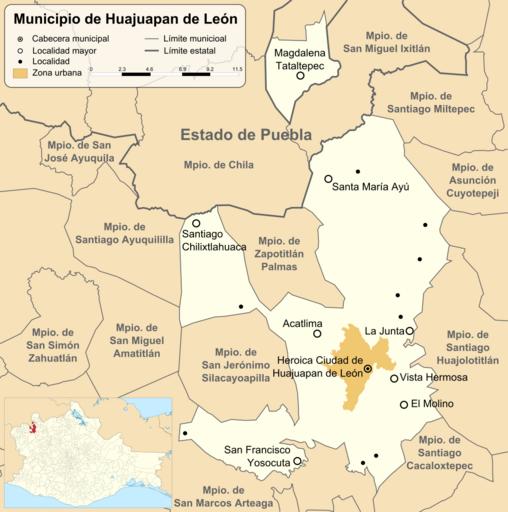 Keywords: Mexico Oaxaca Huajuapan de Leon comunities map.svg Mapa de principales localidades del municipio de Huajuapan de León Oaxaca México own Inkscape 2016-03-13 Battroid SVG maps of Oaxaca