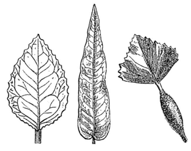 Keywords: Meyers b2 s1014 b1.png de links eiförmiges Blatt Mitte lanzettförmiges Blatt rechts rautenförmiges Blatt Meyers b2 s1014 jpg ca 1885 author PD-Meyers Leaf diagrams Images from Meyers Konversationslexikon 4th edition - text figures