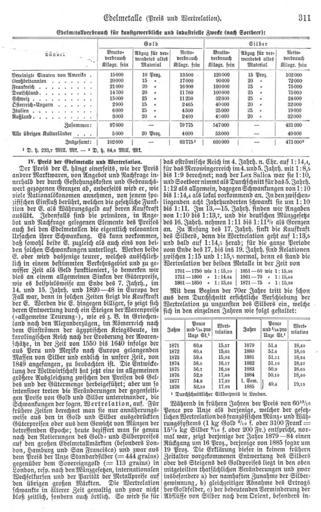 Keywords: Meyers b5 s0311.jpg 5 311 title Precious Metals Price and Relative Worth with chart of precious metals gold/silver prices and relative worth in each nation c 1888 Titel Edelmetalle Preis und Wertrelation mit der Grafik von Gold/Silber-Preis in jeder Nation ca 1888 <br><br><table class wikitable> <tr align center><td> </td><td colspan 3>Gold</td><td colspan 3>Silber</td></tr> <tr align center><td>Länder</td><td> Brutto verbrauch Kilogr fein</td><td>Abzug für verwendetes altes Material</td><td>Netto verbrauch Kilogr fein</td><td>Brutto verbrauch Kilogr fein</td><td>Abzug für verwendetes altes Material</td><td>Netto verbrauch Kilogr fein</td> <tr><td> nowrap Vereinigte Staaten <br>von Amerika</td><td>15000 </td><td>10 Proz </td><td>13500 </td><td>120000</td><td>15 Proz </td><td>102000</td> <tr><td> Großbritannien</td><td>20000</td><td>15 </td><td>17000</td><td> 90000</td><td>20 </td><td>72000</td> <tr><td> Frankreich</td><td>21000 </td><td>20 </td><td>16900</td><td>100000</td><td>25 </td><td>75000</td> <tr><td> Deutschland</td><td>14700</td><td>20 </td><td>11760</td><td>100000</td><td>25 </td><td>75000</td> <tr><td> Schweiz</td><td>15000</td><td>25 </td><td>11250</td><td> 32000</td><td>25 </td><td>24000</td> <tr><td> Österreich-Ungarn</td><td> 2900</td><td>15 </td><td> 2465</td><td> 40000</td><td>20 </td><td>32000</td></tr> <tr><td> Italien</td><td> 6000</td><td>25 </td><td> 4500</td><td> 25000</td><td>25 </td><td>19000</td></tr> <tr><td> Rußland</td><td> 3000</td><td>20 </td><td> 2400</td><td> 40000</td><td>20 </td><td>32000</td></tr> <tr><td> Zusammen </td><td>97600</td><td> -</td><td>79775</td><td>547000</td><td> -</td><td>431000</td></tr> <tr><td> Alle übrigen Kulturländer</td><td> 5000</td><td>20 Proz </td><td> 4000</td><td> 53000</td><td> -</td><td> 40000</td></tr> <tr><td> Insgesamt </td><td>102600</td><td> -</td><td>83775¹</td><td>600000</td><td> -</td><td>471000²</td></tr> </table> ¹ D h 233 7 Mill Mk - ² D h 84 8 Mill Mk 10 May 2009 |