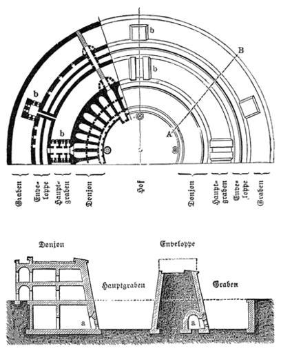 | Keywords: Meyers b6 s0181 b1.png de oben Dürers System Turmfort von links nach rechts Graben Enveloppe Hauptgraben Donjon Hof Donjon Hauptgraben Enveloppe Graben unten Querschnitt von A nach B in Fig 3 Meyers b6 s0181 jpg ca 1885 author PD-Meyers Images from Meyers Konversationslexikon 4th edition - text figures Fortifications |