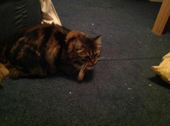 Keywords: still life animal cat pet Background details visible (dirt on rug); focal object blurry (cat fur) Background details visible (dirt on rug); focal object blurry (cat fur)