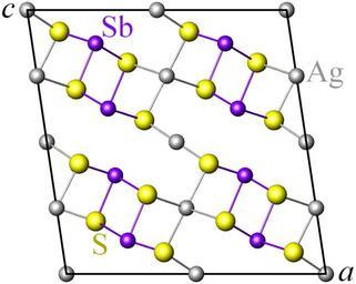 Keywords: Miargyrite.png en Crystal structure of miargyrite AgSbS<sub>2</sub> space group C2/c projected onto the a c plane Violet antimony atoms gray silver atoms yellow sulfur atoms Data source Herta Effenberger Werner Hermann Paar Dan Topa Alan J Criddle and Michel Fleck 2002 The new mineral baumstarkite and a structural reinvestigation of aramayoite and miargyrite American Mineralogist 87 5-6 753-764 own Perditax 2011-05-14 Cc-zero Miargyrite Crystal structures in space group number 15 Sulfur compounds Silver compounds Antimony compounds |