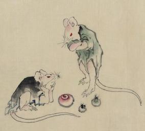 Keywords: Mice in council4.tif Two mice one lying on the ground with head resting on forepaws the other is standing on hind legs with forepaws crossed they are looking at each other with three round objects on the ground between possibly rice cakes 1 drawing on thin handmade paper ink wash color Library of Congresshttp //hdl loc gov/loc pnp/jpd 02816 between 1830 1849 Creator Katsushika Hokusai Fully restored version of File Mice in council jpg Cropped Dirt and stains removed Color balance and brightness changed locally to correct for uneven fade and water damage Histogram adjusted and colors balanced globally See also File Mice in council3 tif partial restoration and File Mice in council4 jpg full restoration compressed PD-old-100 Drawings by Katsushika Hokusai Drawings of mice