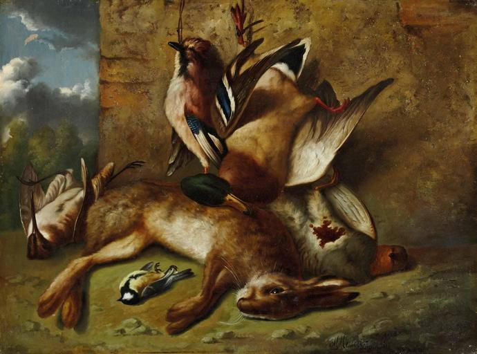 Keywords: Michelangelo Meucci - Natura morta (1887).jpg oil canvas cm 53 72 accession number object history credit line M Meucci Firence 1887 ~ lower right signature and date http //www dorotheum com/dailyauction/lot-detail/lotID/9999/lot/1555873-michelangelo-meucci/e1/gemaelde/e2/oelgemaelde-19-jahrhundert html no_cache 1 sort date cHash 986cd8a989041a6869e7ad6e6b66363b Palais Dorotheum Linz 2013 08 21 lot 194 PD-old-100 Still life paintings of animals 19th-century still life paintings Images from Dorotheum |