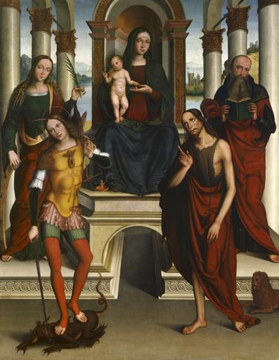 | Keywords: Michele di Luca dei Coltellini - Madonna and Child Enthroned with Saints - Walters 37880.jpg This monumental altarpiece signed and dated by the artist in Latin below the Virgin's throne was once in the now ruined church of Sant'Andrea in Ferrara In front are Saint Michael standing on a dragon and weighing human souls as he will do it at the Last Judgment and Saint John the Baptist Behind these stand Saints Catherine of Alexandria and Jerome Mary's role as a symbol of the Christian Church is emphasized by her placement at the center of a temple-like building that opens up to a beautiful landscape The simple and harmonious style of the painting was a means of expressing devotion Zeri Italian paintings in the Walters Art Gallery 244 366-367 1506 Renaissance oil on panel Painted surface cm 247 3 166 4 3 8 accession number 37 880 1627 Church of Sant'Andrea Ferrara until the late 19th century Santini Collection Ferrara after 1875 mode of aquisition unknown Tavazzi dealer Rome 1902 by purchase Henry Walters city Baltimore Walters Art Museum Henry Walters Acquired by Henry Walters 1912 Signature On the marble step of the throne at the extreme left MICHAELIS / CORTELLINIS; Date After signature MCCCCCIIIIII To Arrest the Ravages of Time Caring for Art at the Walters The Walters Art Gallery Baltimore 1996 place of origin Rome Italy Walters Art Museum license 2D Italian Renaissance paintings in the Walters Art Museum Michele di Luca dei Coltellini Media contributed by the Walters Art Museum needs category review Madonna and Child |