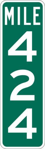 Keywords: Mile Marker 424.svg PD MUTCD Rfc1394 457 1676 18 60 triple digit mile marker D10-3 Made using Viridian SVG Batcher this file was fabricated by a program 2009-03-05 Paul Robinson Rfc1394 Own work all rights released Public domain D10-3 - Distance Signs-3 Digit |
