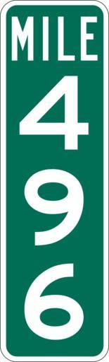 | Keywords: Mile Marker 496.svg  PD MUTCD Rfc1394 457 1676 18 60 triple digit mile marker D10-3 Made using Viridian SVG Batcher this file was fabricated by a program 2009-03-05 Paul Robinson Rfc1394 Own work all rights released Public domain D10-3 - Distance Signs-3 Digit |