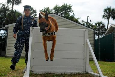 | Keywords: Military working dog training 120621-N-TC587-010.jpg en Master-at-Arms Seaman Sharon Berg a K-9 handler with the military working dog unit at Naval Station Mayport runs her K-9 partner KKowalski through an obstacle course at the base kennel Berg runs the course with KKowalski multiple times a day to promote endurance and motor skills U S Navy photo by Mass Communication Specialist Seaman Damian Berg/Released 2012-06-21 Petty Officer 3rd Class Damian Berg https //www dvidshub net/image/612501 120621-N-TC587-010 2012-06-26 07 26 MAYPORT FL US PD-USGov-Military-Navy Naval Station Mayport Images from DoD uploaded by Fæ |