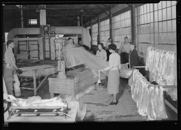 Keywords: Millville, New Jersey - Glass wool. Frederick and Dimmock Co. The second shot of the process - NARA - 518648.jpg Scope and content Millville New Jersey - Glass wool Frederick and Dimmock Co The second shot of the process On the left may be seen the skein of glass as they are brought from the blowing room being heated They are then hung on the racks shown on the right hand side of the picture As this screen has just been started it may be seen how the girls who are drawing out the wool hold the skein in their hands To the left is a man holding a screen ready to be put on the rack as this one is finished In the rear of picture is the oven where the screens are put for baking General notes Same process as describes in photograph NWDNS-69-RP-418 518648 Local identifier 69-RP-419 Federal Works Agency Work Projects Administration National Research Project ca 1941 - ca 1942 NARA-Author Hine Lewis Wickes 1874-1940 Photographer 1122914 <br /> Millville Cumberland New Jersey United States North and Central America inhabited place 3354813 39 4 -75 033 <br /> Still Picture Records Section Special Media Archives Services Division NWCS-S National Archives at College Park 8601 Adelphi Road College Park MD 20740-6001 1937-03-26 Record group Record Group 69 Records of the Work Projects Administration 1922 - 1944 Record group ARC 398 Lewis Hine Photographs for the National Research Project compiled 1936 - 1937 Series ARC 518291 File unit File unit ARC Variant control numbers NAIL Control Number NWDNS-69-RP-419 Other versions <gallery> File Millville _New_Jersey_-_Glass_wool _Frederick_and_Dimmock_Co _The_second_shot_of_the_process_-_NARA_-_518648 tif tif File Millville _New_Jersey_-_Glass_wool _Frederick_and_Dimmock_Co _The_second_shot_of_the_process_-_NARA_-_518648 jpg jpg </gallery> NARA-cooperation PD-USGov Millville New Jersey glassworking industry Glass wool March 1937 1937 in New Jersey Black and white photographs of New Jersey