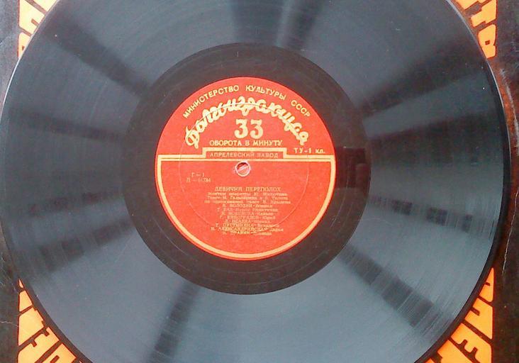 | Keywords: Milyutin-Devichiy-Perepolokh.jpg en Gramophone record 1/4 Moscow Aprelevka 1952 Operetta by Yuri Milyutin ru Г ампластинка Девичий пе еполох - опе етта Ю ия илютина Ап елевский завод 1952 год Одна из пе вых долгоиг ающих 33 обо ота пластинок в СССР Own photograph User Sealle 05/07/2011 Cc-zero Phonographs |