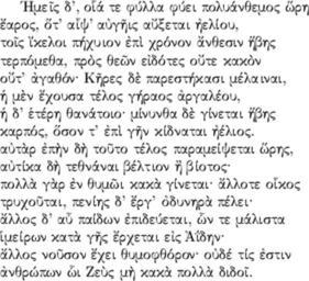 Keywords: Mimnermus.png Source Code <pre> \documentclass12pt article \usepackage ibycus4 \pagestyle empty \begin document \greek Hmei s d' oi a' te fu'lla fu'ei polua'nqemos w 'rh\\ e 'aros o 't' ai y' au gh is au 'cetai h eli'ou \\ toi s i 'keloi ph'xuion e pi` xro'non a 'nqesin h 'bhs\\ terpo'meqa pro`s qew n ei do'tes ou 'te kako`n\\ ou 't' a gaqo'n; Kh res de` paresth'kasi me'lainai \\ h me`n e 'xousa te'los gh'raos a rgale'ou \\ h d' e te'rh qana'toio; mi'nunqa de` gi'netai h 'bhs\\ karpo's o 'son t' e pi` gh n ki'dnatai h e'lios \\ au ta`r e ph`n dh` tou to te'los paramei'yetai w 'rhs \\ au ti'ka dh` teqna'nai be'ltion h ` bi'otos;\\ polla` ga`r e n qumw i kaka` gi'netai; a 'llote oi kos\\ truxou tai peni'hs d' e 'rg' o dunhra` pe'lei;\\ a 'llos d' au pai'dwn e pideu'etai w n te ma'lista\\ i mei'rwn kata` gh s e 'rxetai ei s Ai'+dhn;\\ a 'llos nou son e 'xei qumofqo'ron; ou de' ti's e stin\\ a nqrw'pwn w i Zeu`s mh` kaka` polla` didoi \end document </pre> text Greek language Music of Greece Greek writing Elegies Images with LaTeX source code ImageNote 1 19 1 56 18 350 319 2 Хменис ImageNoteEnd 1 |