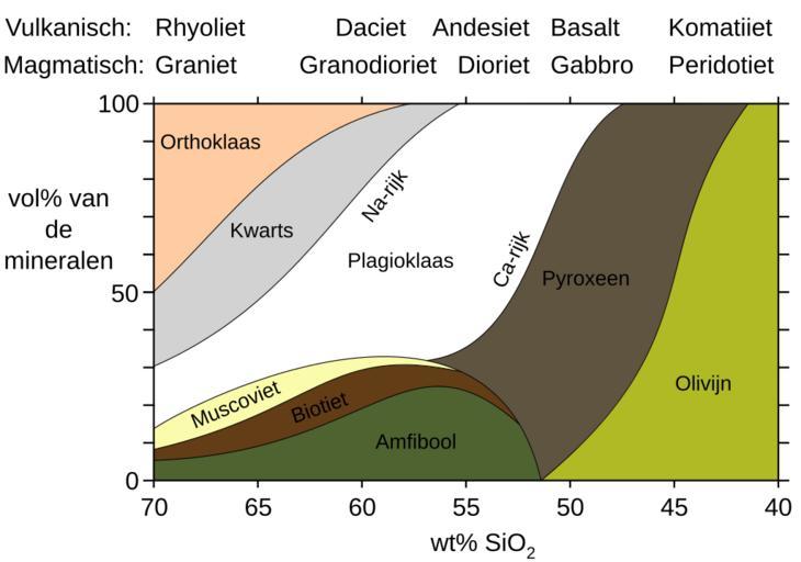 | Keywords: Mineralogy igneous rocks NL.svg nl Determinatieschema voor stollingsgesteenten op grond van mineraalinhoud en massapercentage silica SiO<sub>2</sub> Namen van vulkanische uitvloeiings- gesteenten staan boven namen van magmatische diepte- gesteenten onder Opmerking de exacte grenzen tussen gesteentenamen worden niet alleen door de silicapercentages bepaald maar hangen ook af van concentraties van andere oxiden Dit schema is dus slechts een grove manier om een gesteente te determineren own Woudloper 2009-03 File Mineralogy_igneous_rocks_EN svg; File Mineralogy_igneous_rocks_DE svg Diagrams of igneous rocks Geological diagrams in Dutch |