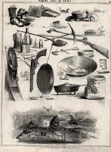Keywords: Miners -sic- Coat of Arms.jpg en Shown on this thin writing paper are an assortment of implements and objects common to a miner's life wash pan pick shovel rocker axe rifle pistol scales cooking utensils playing cards cigar worn boots and hats In the middle however is that ubiquitous companion the flea The lower portion of this letter sheet depicts four miners in a cabin playing cards http //www library ca gov/goldrush/ Lithographed Published by Britton Rey San Francisco Undated circa 1850 PD-old California Gold Rush Files uploaded by PDTillman California in the 1850s |