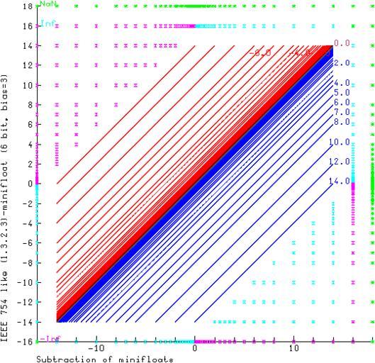 Keywords: MinifloatSubtraction 1 3 2 3 72.png Difference of two minifloats with 1 sign bit s 3 exponent bit e 2 mantissa bit m and a bias of 3 analogues to IEEE-754-like floating point values The different classes of IEEE 754 floating point values NaN infinite normal subnormal and zero are highlighted with different colours and marked with symbols NaN has the highest value and infinite has its own numerical value 2 17 Positive values are in blue and cyan negative values are in red and magenta; NaN is represented in green Please note this picture misrepresents subtraction where one of the values is plus or minus infinity own 2005-10-27 brf no Copyright because of own work Image MinifloatSubtraction_1_3_2_3_300 png GFDL Cc-by-sa-3 0-migrated Cc-by-sa-2 5 2 0 1 0 Minifloats |