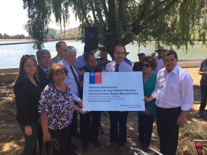 Keywords: outdoor Paine, jueves 24 de noviembre de 2016.- El Ministro de Obras Públicas, Alberto Undurraga, y el Ministro de Agricultura, Carlos Furche, encabezaron hoy la ceremonia de inauguración del nuevo Embalse de Riego Hospital en la comuna de Paine, obra que forma parte del Plan Nacional de Construcción y Rehabilitación Pequeños Embalses del Ministerio de Obras Públicas. El Ministro Alberto Undurraga destacó que “estas obras son muy importantes por su funcionalidad para dar un mejor uso al agua y también para mejorar la calidad de vida y oportunidades de desarrollo de los habitantes de la comuna de Paine”. “Estamos haciendo otros 24 pequeños embalses como este en distintos lugares de nuestro país y dejaremos otros 8 grandes embalses en licitación o construcción, con ello durante el Gobierno de la Presidenta Bachelet, estaremos construyendo más infraestructura para el agua que nunca en la historia de Chile”, explicó el Secretario de Estado. Por su parte, el Ministro de Agricultura, Carlos Furche, manifestó que "esto es muy importante para quienes son beneficiarios directos, más de 1.000 pequeños productores que van a aumentar su capacidad productiva, de frutas y hortalizas que abastecen además a la región Metropolitana". Además, el titular del Agro agregó que esto tiene una importancia que va un poco más allá de haber cumplido a tiempo un compromiso que tomaron hace un año con los dirigentes de esta comunidad, porque permite mostrar que es posible avanzar simultáneamente en la entrega de obras como estas y en la modificación del marco regulatorio. "Ambas cosas se pueden hacer en simultáneo y es lo que estamos haciendo. De manera que esto es una buena noticia para los productores y es un ejemplo de lo que estamos haciendo en todo Chile. Tranques como estos estamos entregando casi todos los meses a lo largo del país", explicó. En la oportunidad, la Secretaria Ejecutiva de la Comisión Nacional de Riego (CNR), María Loreto Mery, destacó que “en materia de planificación del riego estamos trabajando muy de la mano con el Ministro de Obras Públicas, ya que estamos viendo las distintas necesidades multipropósito del recurso hídrico. Algunos de los embalses que estamos rehabilitando no son sólo para riego, sino también para agua potable rural o contribuir ante hechos de emergencia como un incendio forestal”. El nuevo Embalse Hospital permitirá entregar una capacidad de almacenamiento de 200.000 m3, que permitirán a 1.200 pequeños agricultores el riego de más de 2.000 hectáreas de terrenos, principalmente cultivos de frutas y verduras. Las obras, que fueron ejecutadas por el Ministerio de Obras Públicas, a través de su Dirección de Obras Hidráulicas, representaron una inversión de 484 millones de pesos, destacando el retiro de 70.000 m3 de sedimento, el revestimiento en hormigón de 300 metros del canal alimentador que trae las aguas del Río Angostura, el recambio de las 6 compuertas, la construcción de un desarenador y un vertedero para evacuación de crecidas. El Plan de Construcción y Rehabilitación Pequeños Embalses contempla la intervención de 25 embalses, de ellos 8 rehabilitaciones se encuentran terminadas, se trata de los embalses Chada y Hospital en Paine; Los Molles de Melipilla; Santa Rosa en Limache; El Principal de Pirque; Rautén Bajo en Quillota; Santa Julieta y Concepción en Ovalle. Además, de otros 2 en ejecución: Huechún en Melipilla y San Antonio en Ovalle. En paralelo, se encuentra en construcción el Embalse Empedrado en la Región del Maule y en estudio 24 sitios, entre las regiones de Coquimbo y La Araucanía, para construir nuevos pequeños embalses. Durante la ceremonia de inauguración del nuevo Embalse Hospital también participaron el Director General de Aguas, Carlos Estévez; el Director Nacional de Obras Hidráulicas, Reinaldo Fuentealba; la Secretaria Ejecutiva de la CNR, Loreto Mery; el Gobernador de la Provincia del Maipo, Felipe Jeldres y el Presidente de la Comunidad de Aguas del Canal Hospital, Víctor Catalán. Paine, jueves 24 de noviembre de 2016.- El Ministro de Obras Públicas, Alberto Undurraga, y el Ministro de Agricultura, Carlos Furche, encabezaron hoy la ceremonia de inauguración del nuevo Embalse de Riego Hospital en la comuna de Paine, obra que forma parte del Plan Nacional de Construcción y Rehabilitación Pequeños Embalses del Ministerio de Obras Públicas. El Ministro Alberto Undurraga destacó que “estas obras son muy importantes por su funcionalidad para dar un mejor uso al agua y también para mejorar la calidad de vida y oportunidades de desarrollo de los habitantes de la comuna de Paine”. “Estamos haciendo otros 24 pequeños embalses como este en distintos lugares de nuestro país y dejaremos otros 8 grandes embalses en licitación o construcción, con ello durante el Gobierno de la Presidenta Bachelet, estaremos construyendo más infraestructura para el agua que nunca en la historia de Chile”, explicó el Secretario de Estado. Por su parte, el Ministro de Agricultura, Carlos Furche, manifestó que "esto es muy importante para quienes son beneficiarios directos, más de 1.000 pequeños productores que van a aumentar su capacidad productiva, de frutas y hortalizas que abastecen además a la región Metropolitana". Además, el titular del Agro agregó que esto tiene una importancia que va un poco más allá de haber cumplido a tiempo un compromiso que tomaron hace un año con los dirigentes de esta comunidad, porque permite mostrar que es posible avanzar simultáneamente en la entrega de obras como estas y en la modificación del marco regulatorio. "Ambas cosas se pueden hacer en simultáneo y es lo que estamos haciendo. De manera que esto es una buena noticia para los productores y es un ejemplo de lo que estamos haciendo en todo Chile. Tranques como estos estamos entregando casi todos los meses a lo largo del país", explicó. En la oportunidad, la Secreta