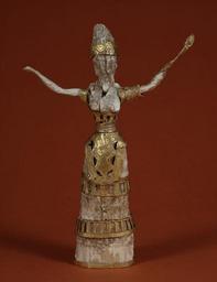 Keywords: Minoan - Goddess or Priestess - Walters 711090.jpg Despite the delicate nature of the precious gold and ivory materials the stance of this small figurine conveys power and strength It closely resembles ceramic statuettes identified as goddesses or priestesses found in the sanctuary space known as the Pillar Shrine within the Minoan palace of Cnossus Crete The snakes adorning the figure are symbolic of fertility and regenerative powers century 16 BC ivory and gold cm 21 5 accession number 71 1090 25734 Feuardent Frères Paris Henry Walters Baltimore date of acquisition unknown by purchase Walters Art Museum Henry Walters Acquired by Henry Walters Ivory The Sumptuous Art The Walters Art Gallery Baltimore 1983-1984 place of origin Crete Greece Walters Art Museum license Ancient Greek sculptures in the Walters Art Museum Snake Goddess Media contributed by the Walters Art Museum needs category review |