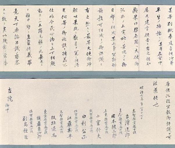 Keywords: MinsenGiin.jpg This document was announced in 1874 It is a historic document in Japan ja 民撰議院設立建白書 PD-old Documents of Japan Japan in 1874 Goto Shojiro Itagaki Taisuke Freedom and People's Rights Movement
