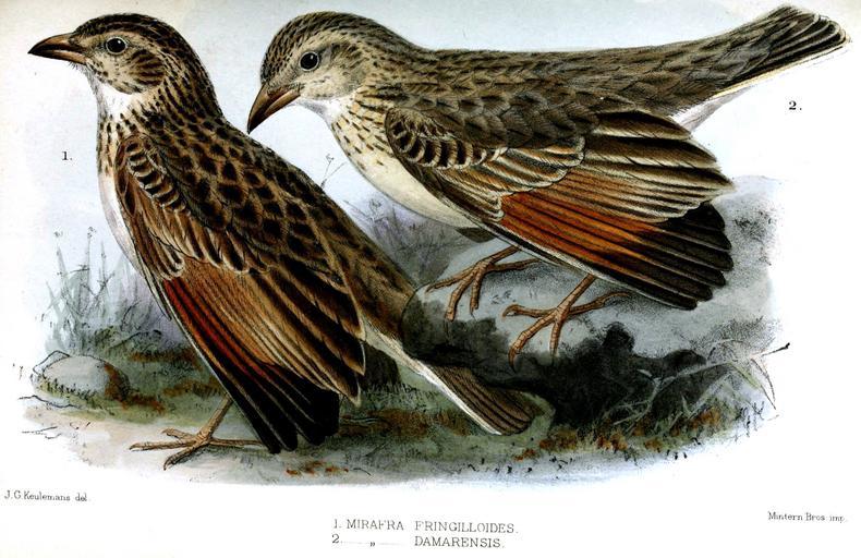 | Keywords: MirafraKeulemans1874.jpg Mirafra fringilloides mirafra cantillans Mirafra damarensis mirafra cantillans damarensis Proceedings of the Zoological Society of London 1874 http //www archive org/stream/proceedingsofgen74zool page/n790/mode/1up web 1874 J G Keulemans pd-old-70 John Gerrard Keulemans Unidentified Alaudidae PZSL 1874 unidentified species Mirafra apiata |