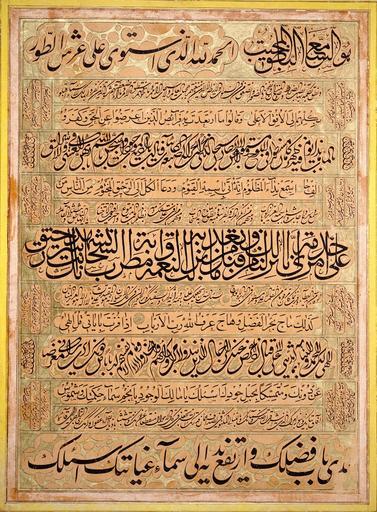 | Keywords: Mishkin-Qalam-23.JPG Calligraphy by Mishkín-Qalam House of Abbud Central Hall Akka <br> The text is from a tablet letter of Baha'u'llah founder of the Baha'i Faith addressed to Ahmad Yazdi <br> Society for Persian Letters Arts Landegg Academy Switzerland 1992 Mishkín Qalam XIX Century Artist Calligrapher Darmstadt Germany Reyhani ISBN 3906714012 This version was taken from the article http //www infosrvr nuk uni-lj si/jana/ICOMd/11Ishikawa pdf ICOM The Conservation and Restoration of a 19th Century Calligraphy of a Baha'i Writing in Arabic by S Ishikawa and P Ravines 1897 Mishkín-Qalam 1826-1912 Reproduction of a painting that is in the public domain because of its age PD-Art Calligraphy by Mishkín-Qalam |