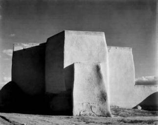 Keywords: Mission Church Taos LC-USZC4-3921.jpg Mission Church at Rancho de Taos ” northern New Mexico built circa 1772 Platinum print photograph by Laura Gilpin in 1930 Reproduction LC-USZC4-3921 color transparency Built in 1772 by Spanish missionaries and native Americans the Mission Church is an amalgam of European and indigenous building traditions Made of adobe a brick composed of straw and mud the walls slope outward to buttress the structure and to fend off the effects of torrential rains The Mission Church was recorded in photographs and drawings by the Historic American Buildings Survey in the 1930s and has enjoyed great popularity with artists such as photographer Laura Gilpin and painter Georgia O'Keefe who both lived nearby Gift of the photographer 1930 LOC-image USZC4 3921 Laura Gilpin PD-USGov Rancho de Taos church Black and white photographs of religious buildings Black and white photographs of New Mexico 1930 in New Mexico Laura Gilpin |