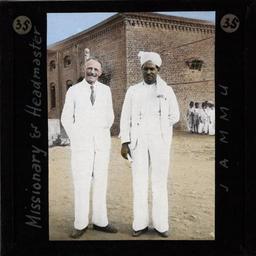 | Keywords: Missionary and Headmaster, Jammu, ca.1875-ca.1940 (imp-cswc-GB-237-CSWC47-LS10-035).jpg en <br> Missionary and Headmaster Jammu ca 1875-ca 1940 Photograph of a missionary and a headmaster standing outside Jammu school Both are dressed in white A group of school children and the red brick school building are visible in the background ; This belongs to a series of Church of Scotland Foreign Missions Committee lantern slides relating to Jammu City which is also known as the City of Temples A mission station occupied by Church of Scotland missionaries was founded here in the late 19th/early 20th century Jammu is also one of the three administrative divisions within Jammu and Kashmir the northernmost state in India Photographer Unknown Filename imp-cswc-GB-237-CSWC47-LS10-035 tif Coverage date 1875/1940 Part of collection International Mission Photography Archive ca 1860-ca 1960 Geographic subject region Jammu and Kashmir Type images Part of subcollection Photographs from the Centre for the Study of World Christianity University of Edinburgh U K ca 1900-ca 1940s Repository name Centre for the Study of World Christianity Archival file impaunpub_Volume7/1752 url Repository address The University of Edinburgh School of Divinity New College Mound Place Edinburgh EH1 2LX United Kingdom Geographic subject country India Format aacr2 1 lantern slide 8 x 8 cm Geographic subject continent Asia Rights Contact the repository for details Part of series In the Temple City of Jammu LS10 Repository email divinity-CSWC ed ac uk Subject lcsh Keyword Teachers; Religious education; Children Date created 1875/1940 Publisher of the digital version University of Southern California Libraries Subject aat genre group portraits Format aat lantern slides Legacy record ID impa-m69303 Access conditions http //www ed ac uk/schools-departments/divinity/research/centres/world-christianity/collections-resources File GB 237 CSWC47/LS10/35 1875/1940 author http //digitallibrary usc edu/cdm/ref/collection/p15799coll123/id/64869 PD-old-70-1923 Magic lantern images Images from USC Digital Library uploaded by Fæ International Mission Photography Archive ca 1860-ca 1960 Missionaries in India People of Jammu |