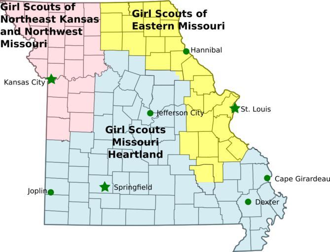 | Keywords: Missouri-gsusa.svg Map of Girl Scout Councils in Missouri my work based on Wikipedia county maps 2008-12-17 Emma Pease Erp Original upload log en wikipedia Missouri-gsusa svg 2009-09-21 21 35 Erp 6676×5110× 287259 bytes <nowiki>modified council boundaries fixed Kansas City</nowiki> 2008-12-18 04 41 Erp 6676×5110× 278334 bytes <nowiki> Map of Girl Scout Councils in Missouri my work based on the wikipedia county map 17-December-2008 Emma Pease </nowiki> Girl Scouts of the USA Council maps Scouting in Missouri |