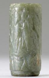 | Keywords: Mitannian - Cylinder Seal with a Row of Human Figures above Animals - Walters 42685 - Side E.jpg This seal depicts a group of Mitannian deities A winged male stands between two bulls and holds aloft a winged disk from which a deity emerges Two male figures kneel on the backs of the bulls in adoration A winged female stands holding small animals and a male deity stands on a lion's back He holds a weapon possibly a mace in one hand and a horned animal in the other; a bird perches on his shoulder The tradition of representing deities on the backs of animals came from central Anatolia between 1500 1300 BC Mitannian carved jadite cm 3 2 1 5 accession number 42 685 17970 Sadie Jones Mrs Henry Walters New York date and mode of acquisition unknown Sale Joseph Brummer New York 1941 Walters Art Museum 1941 by purchase Museum purchase 1941 place of origin Mitanni in Mesopotamia Walters Art Museum license Cylinder seals in the Walters Art Museum Mitannian cylinder seals Mythological hybrids Art of Mesopotamia in the Walters Art Museum Walters Art Museum cylinder seal impressions Cylinder seals 7-dot glyphs Archaeological star glyphs Lions in art of the ancient Near East Birds in art of the ancient Near East Animals in art of the ancient Near East Media contributed by the Walters Art Museum needs category review |