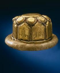Keywords: Mitra Tchudov-klostret - Livrustkammaren - 38923.tif LSH artwork sv Krigsbyge från Narva <br/>Mitra av hattformig modell med cylindrisk kulle med svagt rundad kant Vulstformigt brätte b ca 30 mm klätt med pergament ursprungligen med skinn Kullen klädd med delvis mycket slitet karminrött siden nertill vid brättet ring av förgylld silverplåt b 30 mm med graverad gammalslavisk text översättning se Bodin <br/>År 7 159 november 17 dagen gav statssekreteraren Michail Danilovs hustru änkan Uljana dotter till Vasilij denna biskopsmössa till Tjudovklostret till den undergörande Aleksijs hem till minne av sin make Michail Danilovitj eremitmunken Misail och sin dotter Ksenia för sin själ<br/>Därovanför en krans med sex ursprungligen nio helgonbilder graverade på rektangulära plåtar med trepassformig överdel mellersta bågen spetsig h 83 mm b 58 mm gammalslaviska texter <br/>1 - ett manligt helgon med otydlig text pete ; 2 - ärkeängeln Gabriel achange gabri ; 3 - Maria mrthy mätär Theo - Guds moder ; 4 - ärkeängeln Mikael achage michail ; 5 - evengelisten Petrus apoto petr ; 6 - helgon i biskopsdräkt st alekse miro <br/>På kullens översida en krans med nio runda plåtar med serafer och keruber fyra stycken med text serafim fem med cherubi <br/>Mitt på kullen en stor rund plåt d 102 5 mm med Maria och Jesusbarnet text mrthy Guds Moder <br/>Runt plåtarna broderier med silke silvertråd och -paljetter två ovala genomborrade glaspärlor bevarade <br/>Hatten invändigt stoppad och klädd med blekrött siden original caption mitra Tchudov-klostret - LRK 5388 Slaget vid Narva 1650 silver - silver - silk Färg röd karminröd material siden - parchment size mm 265 bräm g 6145 size mm 150 ca size mm 195 kulle LRK Karl XII av Sverige Mille ans de tradition chret 1988-1989 Kungens lockpipa 1995-1996 Karl XII och Peter den store Peter den store och Karl XII - i krig och fred 1998-1999 Livrustkammaren Krigsbyte 2007-2008 300-årsminnet av slaget vid Poltava / Poltava 300 Years Eremitaget och Kreml-museet 2009-2010 achange gabri Gabriel achage michail Mikael mrthy Mätär Theou - Guds Moder Maria apoto Petr S t Petrus Per st alekse miro S t Alexej Miro achange gabri Gabriel achage michail Mikael mrthy Mätär Theou - Guds Moder Maria apoto Petr S t Petrus Per st alekse miro S t Alexej Miro place of origin original filename lm_t05141 42045 inventory number LRK 5388 38923 CC-BY-SA <gallery caption Different images of same object > File Rysk-ortodox mitra från 1650 - Livrustkammaren - 47481 tif </gallery> Battle of Narva 1700 Headgear Media contributed by LSH dim-with multiple size templates Media contributed by LSH 2014-11 |