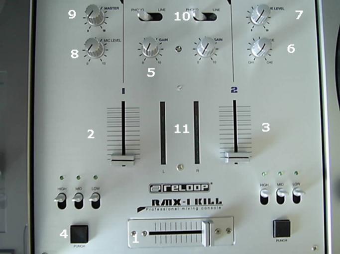 Keywords: Mixer 2.jpg 1 Crossfader Schaft einen à bergang vom linken bzw rechten zum anderen Turntable/CD-Player 2 Lautstärkeregulierer des linken Turntables/CD-Player Beeinflusst nicht die Lautstärke des Kopfhörers 3 Lautstärkeregulierer des rechten Turntables/CD-Player Beeinflusst nicht die Lautstärke des Kopfhörers 4 Punch-Button Solange man ihn drückt wird der Sound aus dem jeweiligen Turntable/CD-Player eingespielt 5 Gain-Level Reguliert die Lautstärke der Vorverstärker im Mixer 6 CUE So ähnlich wie der Crossfader nur dient er dazu zwischen zwei Turntables/CD-Player hin und her zu schalten was nur im Kopfhöhrer zu hören ist Wird benötigt beim Beatmatching 7 CUE-Level Lautstärkeregulierung des Kopfhörers 8 Mic-Level Lautstärkeregulierung des Mikrofons 9 Master Mit dem Master-Regler wird die Ausgangslautstärke des Mixers eingestellt 10 Schaltet zwischen Phono oder Line Eingang um An Phono werden die Turntables angeschlossen an Line kann man einen CD-Player oä Geräte mit LINE-Pegel anschließen 11 de VU-Meter Das de VU-Meter zeigt an wie stark das Signal ist das ausgegeben wird Bei einigen Mixern gibt es auch de VU-Meter für die Signal-Eingänge Benjamin Bornschein Disc jockeys DJ mixers |