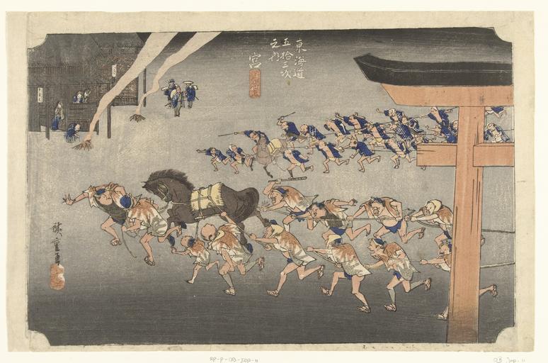 Keywords: Miya, Shintoïstische ceremonie bij het Atsuta heiligdom-Rijksmuseum RP-P-OB-JAP-11.jpeg accession number RP-P-OB-JAP-11 Utagawa; Hiroshige I Utagawa died 1858; Takenouchi Magohachi Hoeido Hiroshige I credit line GWToolset Rijksmuseum nl Twee groepen mannen zich vasthoudend aan touwen bevestigd aan aangedreven paarden; op de voorgrond een torii; op de achtergrond toeschouwers bij houten huizen met rokende vuren; bij avond Label Line mentioned on object Hiroshige I Utagawa 1797 - 1858 1828 - 1835 kleurenhoutsnede; lijnblok in zwart met kleurblokken Collection prenten; Japan collectie beeld Height mm 225 beeld Width mm 346 exhibition history paper object history object type PD-US PD-old Data and photography rights All data and all images made available through the API are either in the public domain or are subject to a CC0 license https //www rijksmuseum nl/en/api/terms-and-conditions-of-use cc-zero place of creation Japan; Tokyo http //www rijksmuseum nl/collectie/RP-P-OB-JAP-11 http //hdl handle net/10934/RM0001 COLLECT 45989 handle Miya Shintoïstische ceremonie bij het Atsuta heiligdom Uploaded with GWToolset Rijksmuseum RP-P-OB-JAP-11 http //www rijksmuseum nl/media/assets/RP-P-OB-JAP-11 Images uploaded by Fæ Japanese 19th-century prints in the Rijksmuseum Amsterdam Images from the Rijksmuseum |