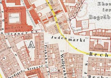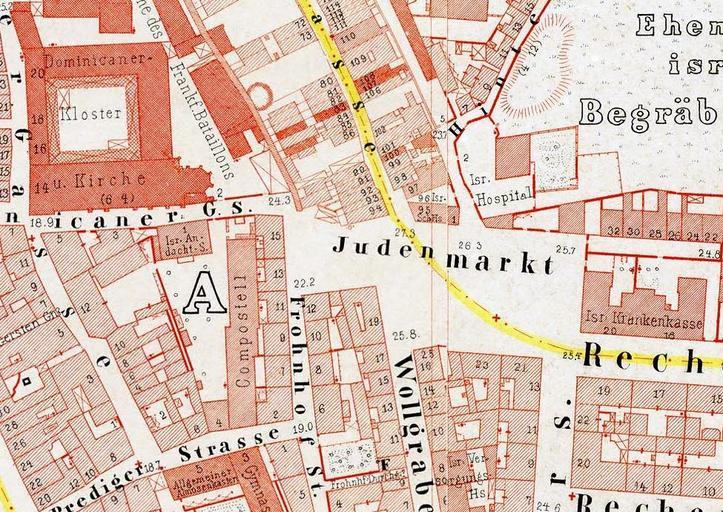 Keywords: Mk Frankfurt Ravenstein Judenmarkt.jpg Ausschnitt aus dem Ravenstein-Plan von Frankfurt am Main 1862 Zu sehen ist ein Gebiet im Südosten der Frankfurter Altstadt rund um den Judenmarkt heute Börneplatz Im Norden mündet die Judengasse im Nordosten liegt der Alte Jüdische Friedhof im Südosten das Fischerfeldviertel Im Nordwesten liegt das Dominikanerkloster südlich davon der Kompostellhof südlich von diesem der Arnsburger Hof Dominikanerkloster und Judengasse sind durch die Staufenmauer voneinander getrennt die kreisförmige Signatur ist die Ruine des Mönchsturms Nur das Dominikanerkloster und der Jüdische Friedhof sind bis heute erhalten Crop from Ravenstein's map of Frankfurt am Main 1862 showing an area in southeastern Old City around Judenmarkt Jew's Market today Börneplatz North of it is Judengasse Jew's Lane northeast is the medevial Jewish Cemetery southeast the rectangular grid of Fischerfeldviertel In the northwest you see Dominikanerkloster Dominican's monastery divided from Judengasse by the Staufenmauer 12th century city wall note the circular shape of Mönchsturm Monk's tower South of the church is Compostell a former hospice for St James' Way pilgrims later used by the jewish community Only the monastery church and the Jewish Cemetery survived until today in modern Frankfurt Stadtpläne Frankfurt Ravenstein1862 Dominikanerkloster Frankfurt Kompostellhof Börneplatz Judengasse Frankfurt 1862 in Frankfurt am Main Artworks missing infobox template |