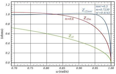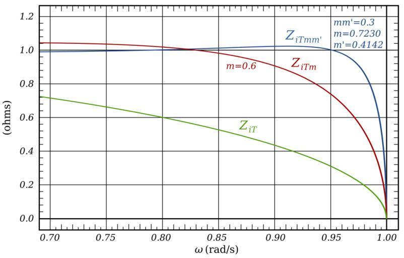 Keywords: Mm'-Derived Low-pass Image Impedance.svg image impedances of prototype low-pass mm'-derived filter m-derived filter and constant-k filter in the region immediately below <var>ω</var> <var>ω</var><sub>c</sub> 1 The parameters of the mm'-derived filter are <var>m</var> 0 7230 <var>m'</var> 0 4124 <var>mm'</var> 0 3 The parameter of the m-derived filter is <var>m</var> 0 6 These filters both have the optimum impedance matching for their types <math>Z_ iT mm' \frac \sqrt 1-\omega 2 \left 1- 1-m 2 \omega 2 \right 1-\left \omega/\omega_\infin\right 2 </math> where <math>\omega_\infin \frac \omega_c \sqrt 1- mm' 2 </math> <math>Z_ iT m \frac \sqrt 1-\omega 2 1-\left \omega/\omega_\infin\right 2 </math> where <math>\omega_\infin \frac \omega_c \sqrt 1-m 2 </math> <math>Z_ iT \sqrt 1-\omega 2 </math> own 2009-11-26 Inductiveload Mathematica Code <pre><nowiki> wc 1; mm'-derived m1 0 7230; m2 0 4134; mm m1 m2; winfmm wc/Sqrt1 - mm 2; zitmmw_ Sqrt1 - w 2 1 - 1 - m1 2 w 2 / 1 - w/winfmm 2 ; m-derived m 0 6; winfm wc/Sqrt1 - m 2; zitmw_ Sqrt1 - w 2/ 1 - w/winfm 2 ; constant-k zitw_ Sqrt1 - w 2 Plot zitmmw zitmw zitw w 0 6 1 PlotRange -> All </nowiki></pre> M-Derived filters Mm'-Derived filters Constant-k filters Image impedance |