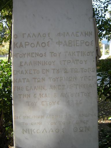 Keywords: Mnimeio favierou palataki haidari.JPG el Το νημείο Κάρολου Φαβιέρου είναι ίσως το αλιότερο μνημείο του Χαϊδαρίου αφού φιλοτεχνήθηκε με ρωτοβουλία του ικολάου Θων ρος τιμήν του φιλέλληνα Κάρολου Φαβιέρου για την συμβολή του στις μάχες του Χαϊδαρίου στις 6 και 8 Αυγούστου 1821 Σήμερα η ροτομή είναι α οκομμένη α ό την μαρμάρινη στήλη η ο οία συνεχίζει να κοσμεί τον ερίβολο της έ αυλης Παλατάκι μ ροστά α ό το αναψυκτήριο «Ιστορικόν» Το στηθαίο του μνημείου βρίσκεται σήμερα στην αίθουσα Δημοτικού Συμβουλίου στο νέο Δημαρχείο αφού υ έστη εργασίες συντήρησης ΦΩΤΟΓΡΑΦΙΑ ΔΗ ΟΣ ΧΑΪΔΑΡΙΟΥ ΑΓ ΩΣΤΗ Cc-zero Uncategorized 2014 April 23 Κατηγορία Χαϊδάρι |