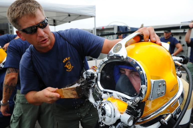 | Keywords: Mobile Diving and Salvage Unit 2 DVIDS302525.jpg en Petty Officer 1st Class Ronald Byrum Navy diver applies soapy water to the air supply connections on the Kirby Morgan 37 diving helmet of Navy Diver 1st Class Dean Bates to check for air leaks Both divers are assigned to Mobile Diving and Salvage Unit 2 and are conducting mixed-gas and air diving operations aboard the Military Sealift Command fleet ocean tug USNS Apache 2010-07-12 Petty Officer 2nd Class Jayme Pastoric https //www dvidshub net/image/302525 100712-N-+++++-480 2010-07-24 21 06 SOLOMON'S ISLAND MD US PD-USGov-Military-Navy United States Navy Mobile Diving and Salvage Unit Two Images from DoD uploaded by Fæ Diving helmets |