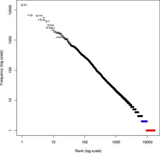 Keywords: Moby Dick Words.gif graph hapax legomena red e g matrimonial and about 17 occur only twice are dis legomena blue e g dexterity Words are counted from Project Gutenberg text at http //www gutenberg org/etext/2701 own Radagast3 2010-05-12 Computational linguistics Moby Dick |