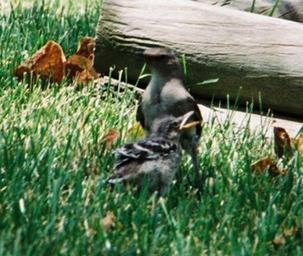 Keywords: Mockingbird Feeding Chick002.jpg Northern Mockingbird Feeding Her Chick Own 2007-07-12 Lsi john Mimus polyglottos juvenile Birds feeding young