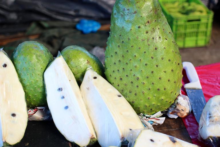 Alajuela's public market. Fruit. Pieces of soursop (la guanábana). Alajuela, Costa Rica.