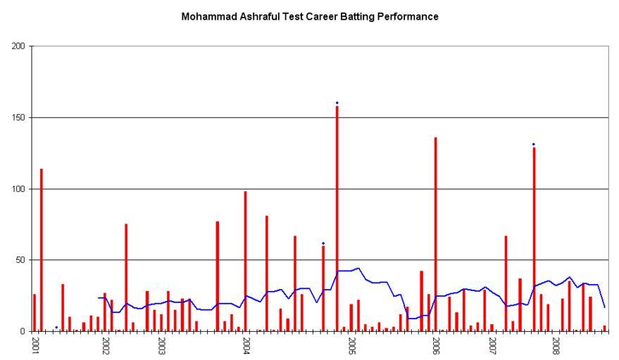 Keywords: Mohammad Ashraful graph.png Test Match performance of Mohammad Ashraful It was created by Raven4x4x The red bars indicate the player's test match innings while the blue line shows the average of the ten most recent innings at that point Note that this average cannot be calculated for the first nine innings The blue dots indicate innings in which Ashraful finished not-out This graph was generated with Microsoft Excel 2002 using data from Cricinfo http //stats cricinfo com/statsguru/engine/player/55988 html class 1;orderby start;template results;type batting;view innings and Howstat http //www howstat com au/cricket/Statistics/Players/PlayerProgressBat asp PlayerID 2964 The information in this graph is current as of 30 March 2008 2007-12-30 Own Raven4x4x wikipedia en Raven4x4x original upload log page en wikipedia Mohammad_Ashraful_graph png 2007-12-30 06 24 Raven4x4x 986×574 4714 bytes <nowiki>This graph details the Test Match performance of Mohammad Ashraful It was created by Raven4x4x The red bars indicate the player's test match innings while the blue line shows the average of th</nowiki> 2008-01-19 07 31 Raven4x4x 986×574 4833 bytes <nowiki>Updated The information in this chart is current as of 19 January 2007 </nowiki> 2008-03-30 06 21 Raven4x4x 986×574 4892 bytes <nowiki>Updated The information in this graph is current as of 30 March 2008 </nowiki> DEFAULTSORT Ashraful Mohammad 1984 births Bangladesh Test cricketers Cricket graphs |