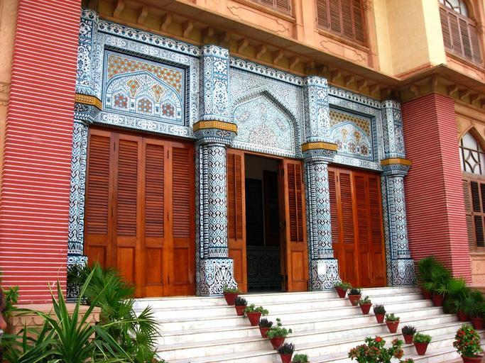 Keywords: Mohatta Palace Khi.jpg en Entrance of Mohatta Palace Karachi Own Shahid1024 Buildings in Karachi Outside stairs in Pakistan Entrance stairs Wooden doors in Pakistan Potted plants Mohatta Palace Karachi Decorated tiles in Pakistan