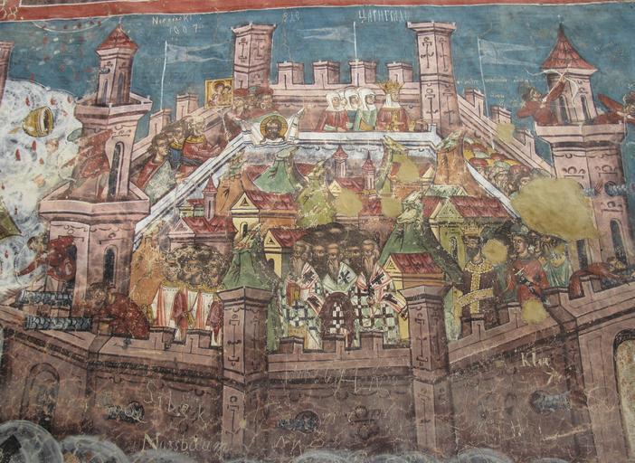 Keywords: Moldovita murals 2010 38.jpg Representation of the Siege of Constantinople 626 by the Avars on a mural at the Moldoviţa Monastery Romania The siege depicted in actual fact is the en Fall of Constantinople to the Ottomans in 1453 as illustrated by the presence of artillery and the dress of the besieging forces The church is one of the Painted churches of northern Moldavia listed in UNESCO's list of World Heritage sites Asediul Constantinopolului 626 de către avari într-o pictură murală de la Mănăstirea Moldovița own photo 14 d'Août 2010 Man vyi Own work all rights released Public domain Moldovita murals Firearms in art Fall of Constantinople in art |
