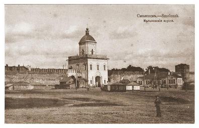 Keywords: Molohovskie gate 5.jpg en View on Molohovskie gate now do not exist from the current Victory Square Right - Moss Tower preserved to this day ru Вид на олоховские во ота ныне не существуют со сто оны нынешней площади Победы Сп ава - оховая башня сох анилась до наших дней О игинальная отк ытка е установлены before 1917 года PD-RusEmpire 20th-century postcards Postcards of Smolensk Molohovskie gate