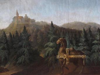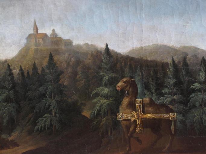 Keywords: Molsheim Jésuites114.JPG fr Alsace Bas-Rhin Molsheim Eglise des Jésuites Peinture devant d'autel Arrivée de la croix à Niedermünster XVIIIe self-photographed Rh-67 2011 cc-by-sa-3 0 Artwork / Œuvre d'art / Kunstwerk Artist La peinture montre 2 scènes successives de l'histoire légendaire de la croix que fit réaliser le duc de Bourgogne pour abriter les reliques que Charlemagne lui avait offertes en 802 après les avoir reçues lui-même du patriarche de Jérusalem en 799 Il confia cette croix à un chameau et à la Providence pour qu'ils choisissent le lieu où la croix devait être conservée et livrée à la vénération des fidèles Au centre du tableau le chameau porte la croix-reliquaire il est suivi à distance par les chevaliers du duc Hugues de Bourgogne ; à droite le chameau s'est agenouillé devant l'abbaye de Niedermunster XVIIIe siècle oil canvas cm 53 196 Eglise de Jésuites Molsheim Autel secondaire de la Croix ou de la Vierge IM67009663 PM67000532 IM67001373 object history Devant d'autel datant sans doute du 4e quart du 18e siècle reproduisant la scène qui figurait sur le retable de l'autel de la Croix du 17e siècle 1669 connue par la gravure de P Aubry Le Mont Sainte-Odile représenté dans le fond comporte encore sa chapelle romane circulaire qui fut incendiée en 1681 L'abbaye de Niedermunster représentée ne correspond évidemment pas à son état du 17e siècle étant abandonnée et en ruine depuis le 16e siècle other versions Ralph Hammann PD-old accession number Taken with Canon PowerShot SX20 IS Photographs of Molsheim by Ralph Hammann Arrivée de la Croix à Niedermunster Paintings of crosses Mont Sainte-Odile Details of 18th-century paintings Textile antependia 18th-century antependia Baroque antependia Paintings of camels Couvent du Mont Sainte-Odile Ottrott in art |