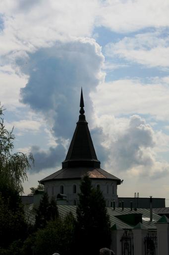 Keywords: monastery historic building white religion russian orthodox tent roof steep roof spire black trees clouds sky