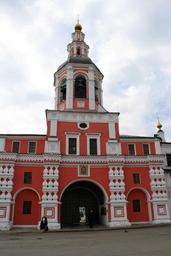 Keywords: monastery historic religion russian orthodox arch entrance spire pillars bell tower red clouds sky