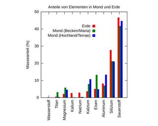 Keywords: Mond - Erde Elementanteile.svg Vergleich der Massenanteil verschiedener wichtiger Elemente in Erde Mond-Ebene und Mond-Hochland Datenquelle http //www permanent com/l-apollo htm own 2012-04-12 LeastCommonAncestor Derived from File Moon vs earth composition svg Gnuplot <pre> set ylabel Masseanteil set yrange 0 50 set y2range 0 50 set x2label 'Anteile von Elementen in Mond und Erde' set key at graph 0 5 0 8 vertical samplen 0 05 set size ratio 1 set xtics rotate set bmargin 6 set style data histogram set style fill solid plot '-' using 2/10000 xtic 1 title 'Erde' \ '-' using 1/10000 title 'Mond Ebene ' \ '-' using 1/10000 title 'Mond Hochland ' Wasserstoff 1400 Titan 4400 Magnesium 20900 Kalium 25900 Natrium 28300 Kalzium 36300 Eisen 50000 Aluminum 81300 Silizium 277000 Sauerstoff 466000 e 54 31000 57600 1100 2900 78800 132000 69700 212000 417000 e 56 3100 45500 800 3100 106800 48700 133000 210000 446000 e </pre> Cc-zero Moon diagrams |